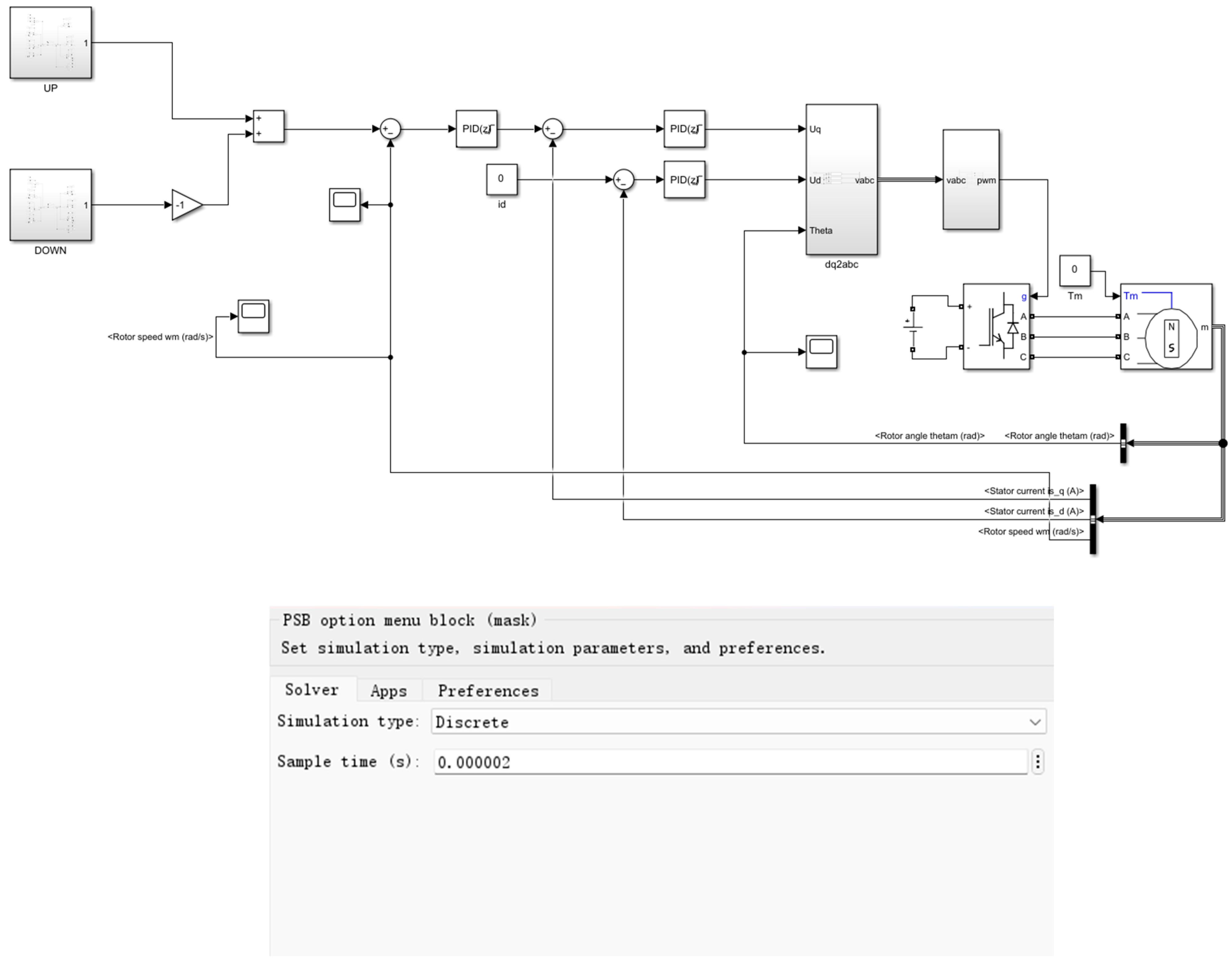 Figure 4 where the velocity is positive, while the “down” module corresponds to the portion with negative velocity. The parameters of the PID Controller in the diagram are as follows: P = 10, I = 100, D = 0. The parameters of PID Controller2 are as follows: P = 2.5, I = 40, D = 0. The parameters of PID Controller1 are as follows: P = 4, I = 45, D = 0. The motor control circuit includes an S signal module, a PID module, a motor module, a parking module, and a Clark module. The S signal module contains an S wave, which is mainly used to provide the motor reference signal, the PID module implements the proportional-integral-derivative (PID) algorithm to control the motor speed, and the Park module transforms the variables of the three-phase stationary coordinate system (ABC or αβ) into the variables under the rotating coordinate system (dq axis). The Clark Transform module transforms the three-phase stationary coordinate system (ABC) to the two-phase stationary coordinate system (αβ). The permanent magnet synchronous motor module outputs the dynamic response of torque, speed, and rotor position angle (θ), and supports seamless connection with the Park/Clark transform, PID controller, inverter, and other modules to achieve closed-loop control.