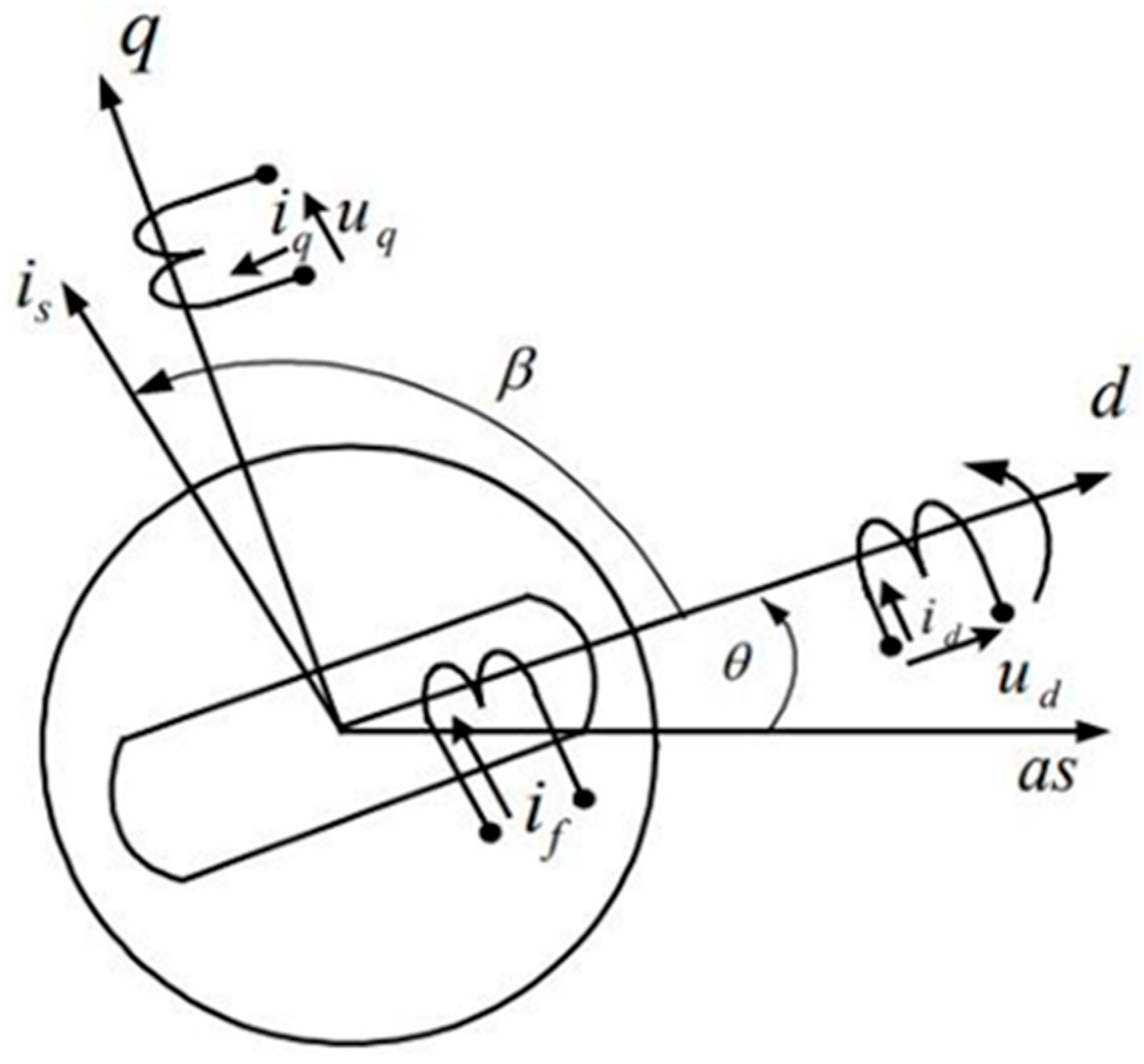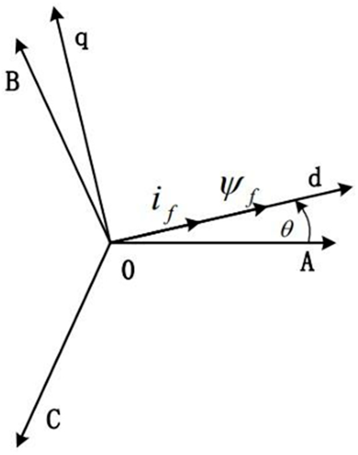 33]. Therefore, the mathematical model of PMSM can be greatly simplified by using coordinate transformation to create a two-phase coordinate system, i.e., a dq coordinate system that rotates synchronously with the rotor of PMSM and such that the dq axis of the coordinate system always coincides with the pole axis of the rotor of PMSM [