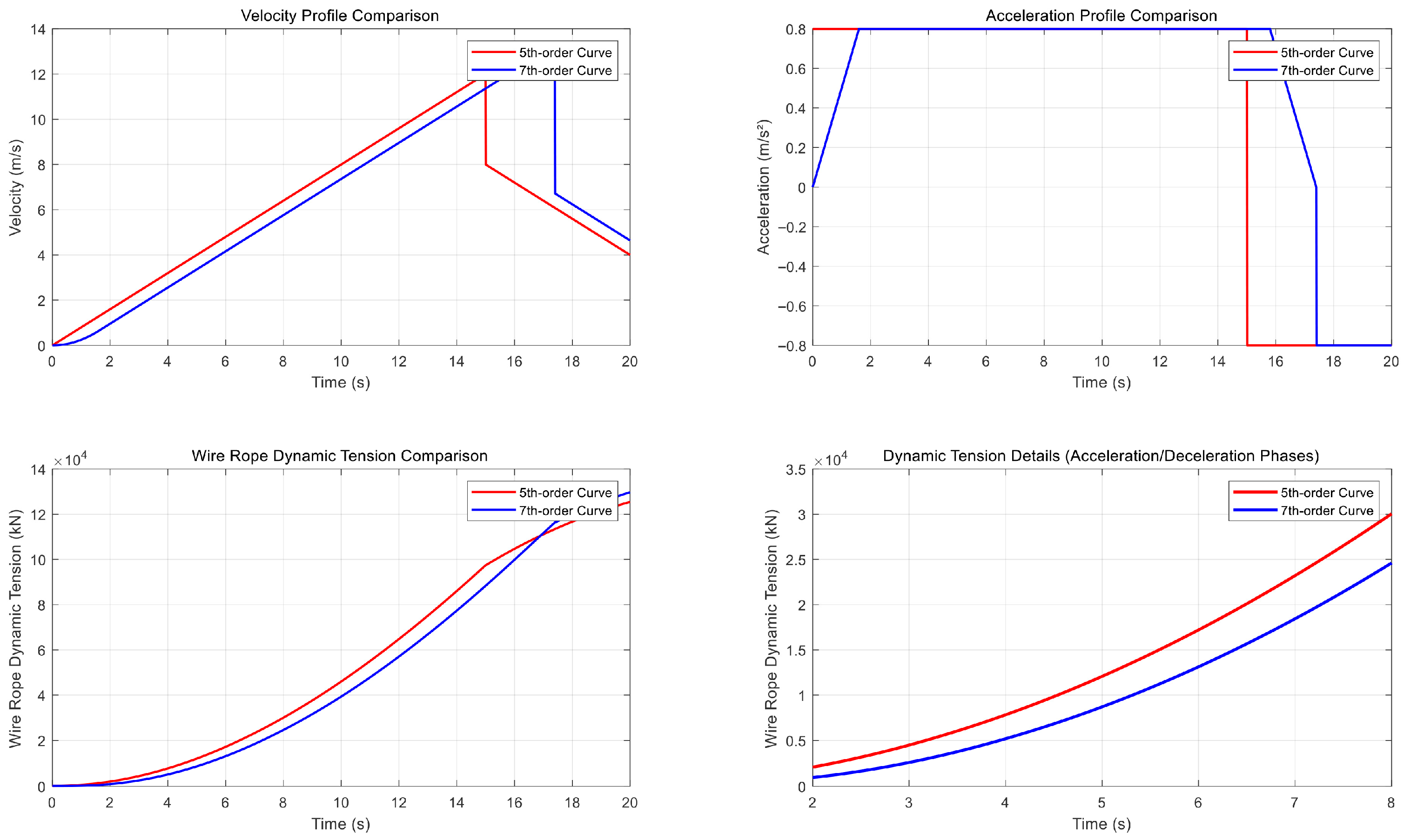 Figure 10 clearly shows that the seventh-order S-curve, by virtue of its smooth acceleration transitions, significantly suppresses the dynamic tension fluctuations in the wire rope. Quantitatively, compared to the fifth-order curve, the seventh-order S-curve reduces the peak dynamic tension by approximately 24% and decreases the tension fluctuation amplitude by about 34%. This data directly validates that the seventh-order S-curve effectively mitigates wire rope vibration intensity and dynamic stress, thereby mechanistically quantifying its contribution to reducing wear risk and extending equipment service life.