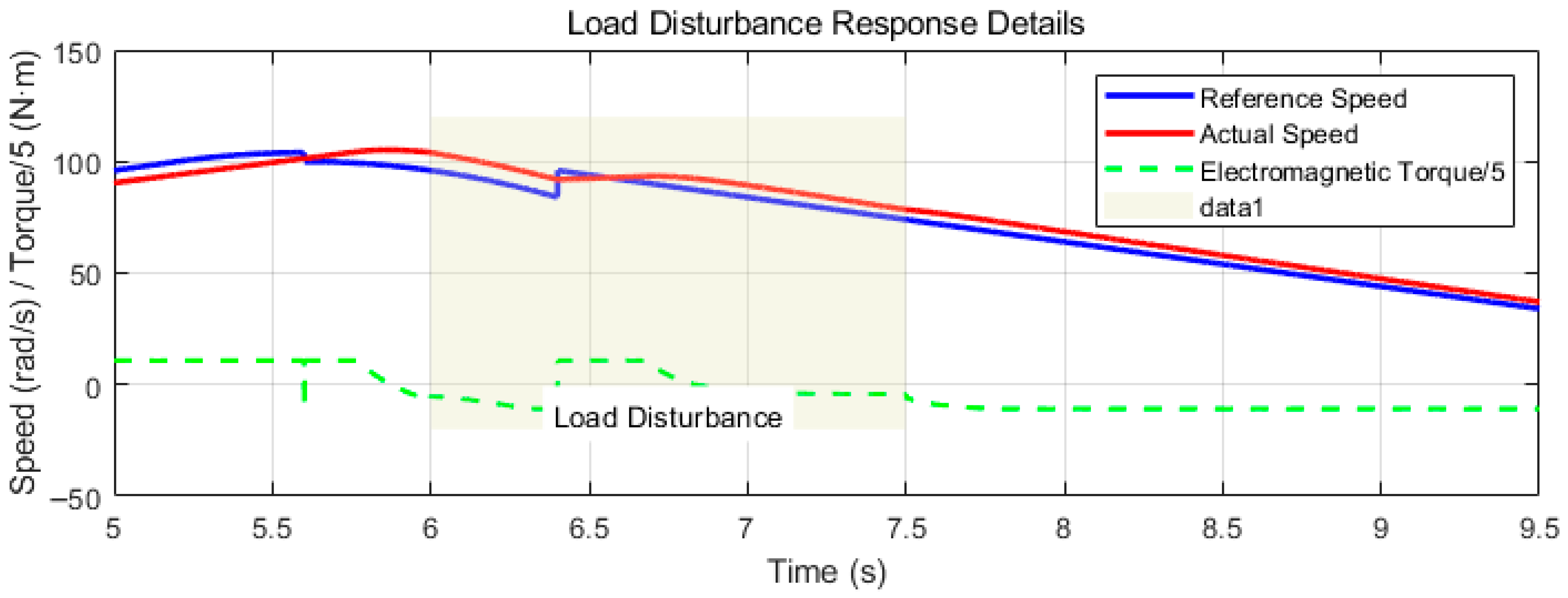 Figure 11 verifies the robustness of the PID controller based on seventh-order S-curve velocity planning against sudden load disturbances during the constant-speed phase through simulation. As shown in the figure, when a 35 N·m step load torque is applied at t = 6 s, the motor speed exhibits only a minor and brief undershoot (approximately 3.5%) and quickly and smoothly recovers to the target speed within 0.25 s. The immediate response of the electromagnetic torque (corresponding to the q-axis current) effectively compensates for the load variation, demonstrating that this control strategy can reliably ensure the stable operation of mine hoists under load fluctuations.