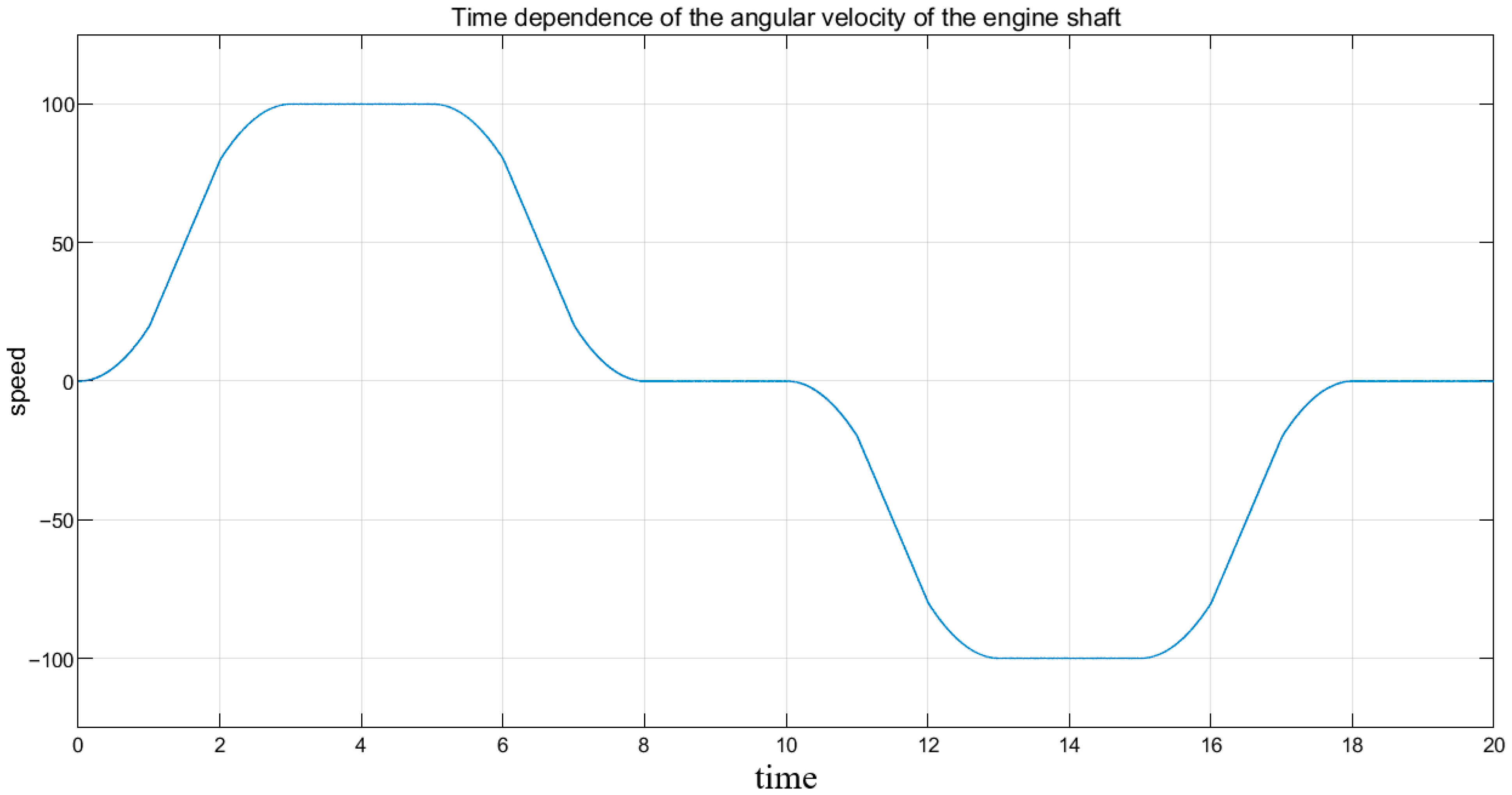 Figure 13: X-axis (time)—time interval of the lifting machine operation (unit: seconds). Y-axis (angle)—change in the rotation speed of the mechanism (unit: rad/s).
