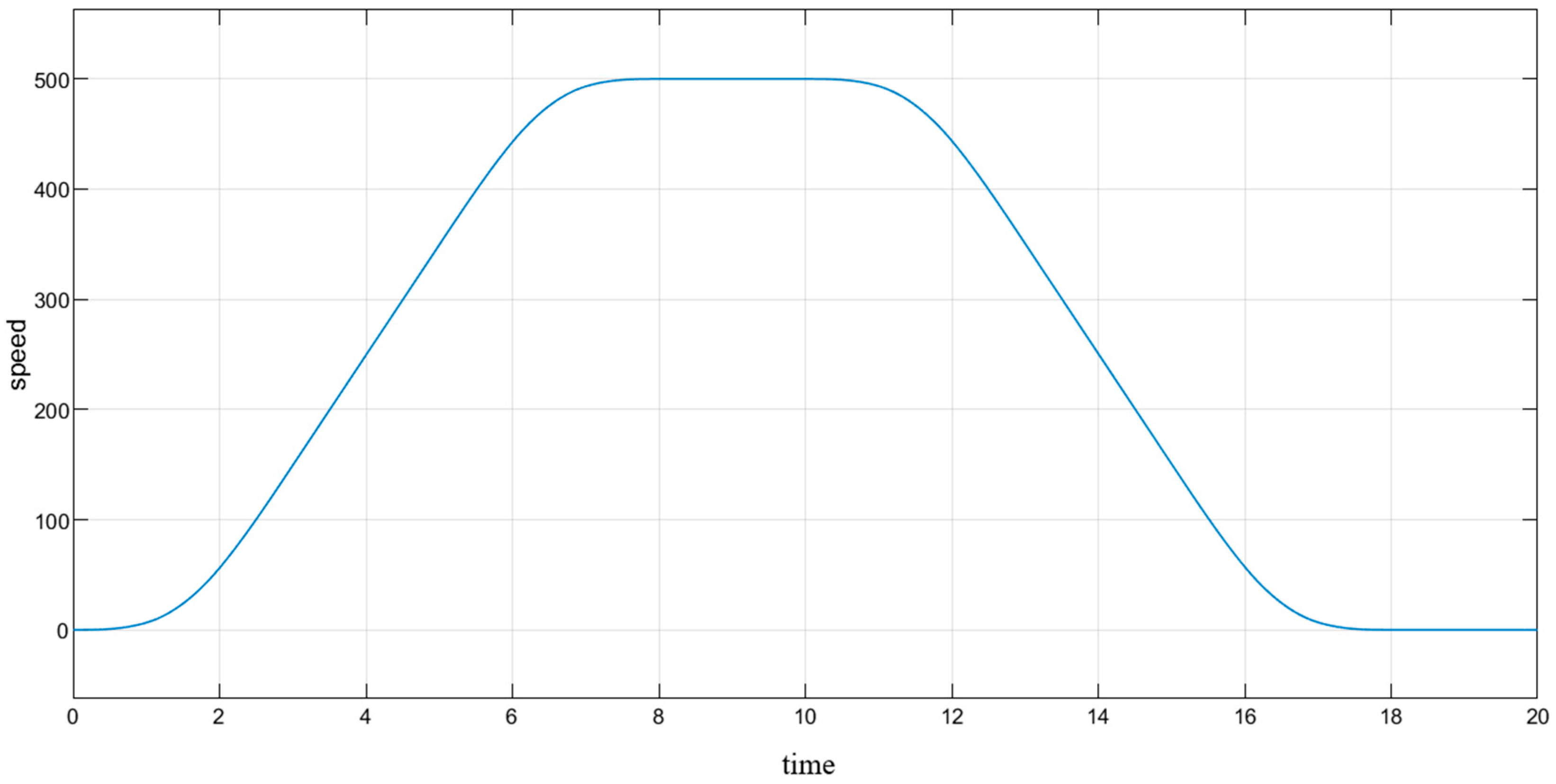 The seventh-order S-curve serves as the reference speed input to the PID controller of the permanent magnet synchronous motor, enabling optimized speed control of the motor. The relevant motor parameters are as follows: Stator phase resistance Rs (Ohm): 0.0485; Armature inductance (H): 0.000395; Inertia, viscous damping, pole pairs, static friction [J(kg·m2) F(N·m·s) p() Tf(N·m)]: [0.0027, 0.0504924, 1, 0]. The motor operates stably when the rotational speed reaches 500 revolutions per second.