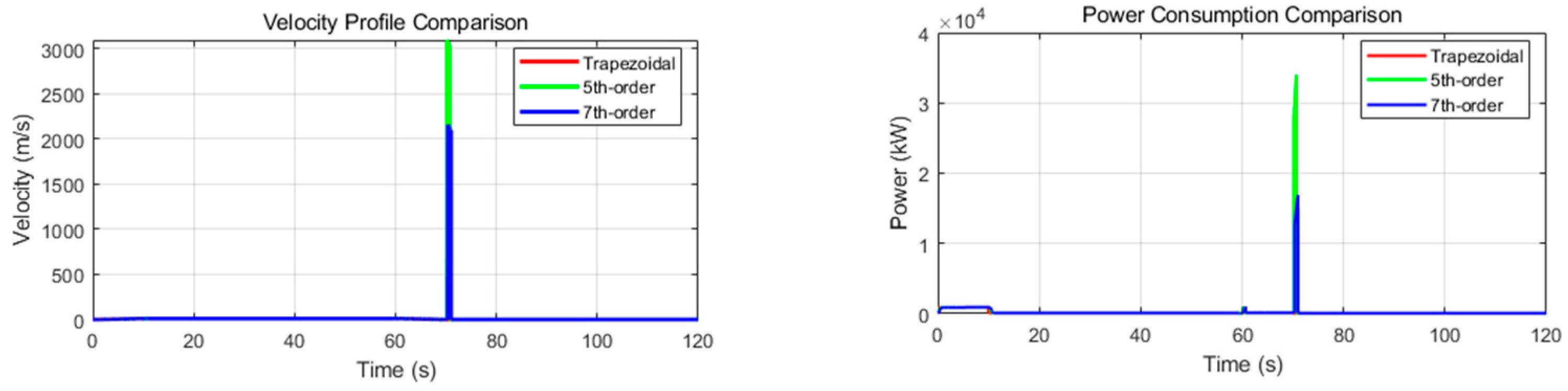 Figure 14 further compares the system power consumption of the three algorithms during operation. Overall, due to abrupt acceleration changes, the trapezoidal profile leads to significant power fluctuations and higher peak power consumption. In comparison, the 5th-order and 7th-order curves, benefiting from their smoother motion profiles, exhibit more stable power consumption and lower overall energy usage, demonstrating superior energy efficiency, especially over prolonged operation.