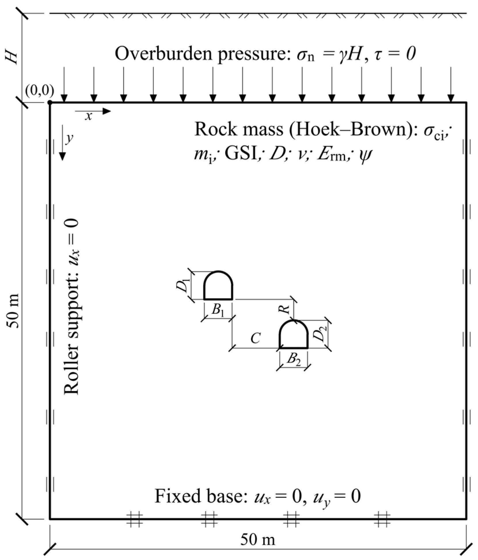 Figure 2) represents a 50 × 50 m rock mass domain containing two parallel horseshoe-shaped underground excavations. The model dimensions were selected to eliminate the influence of boundary effects. The mechanical behavior of the rock mass was simulated using an elastoplastic constitutive model with a Hoek–Brown yield criterion, developed for fractured rock masses [