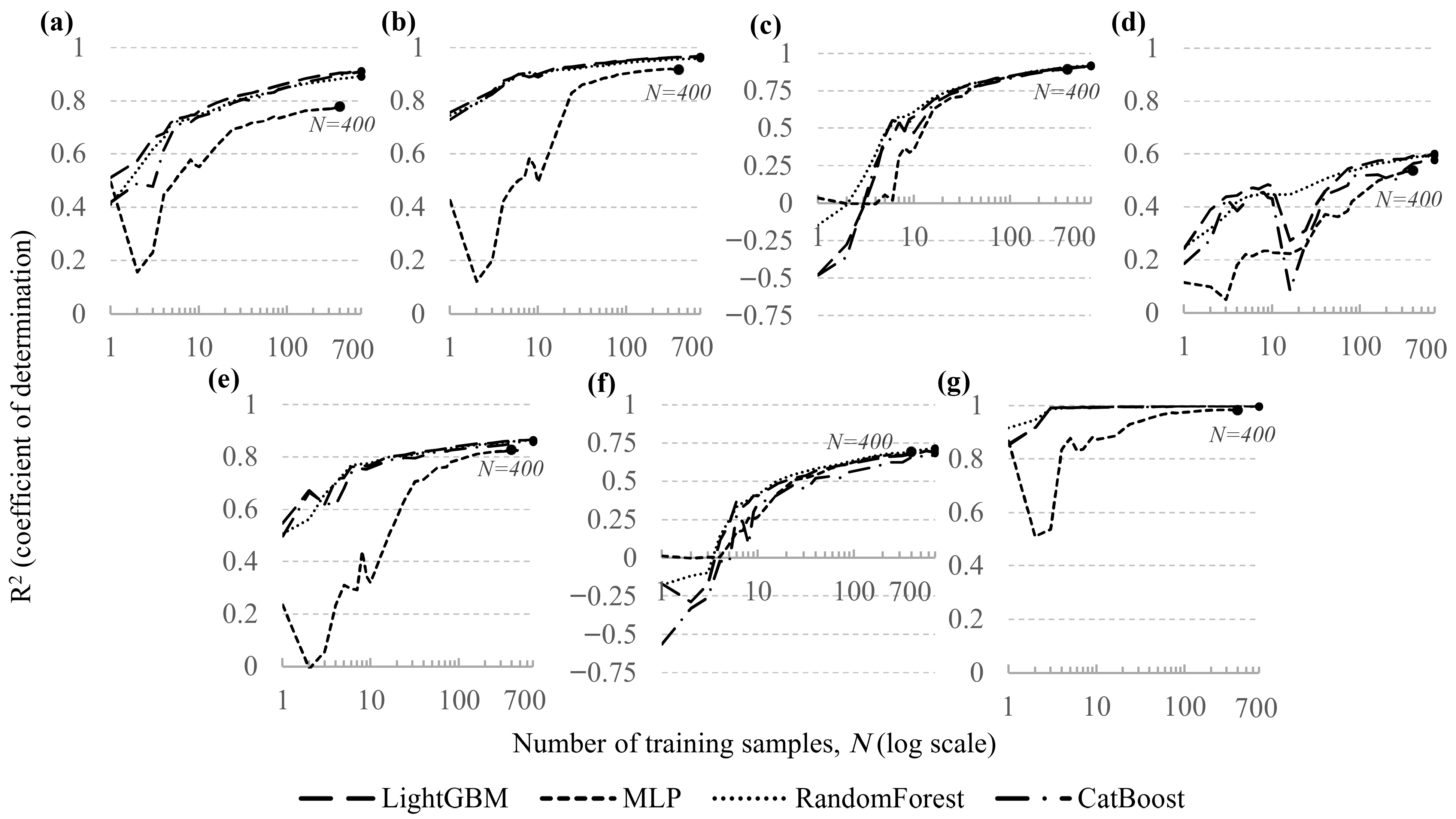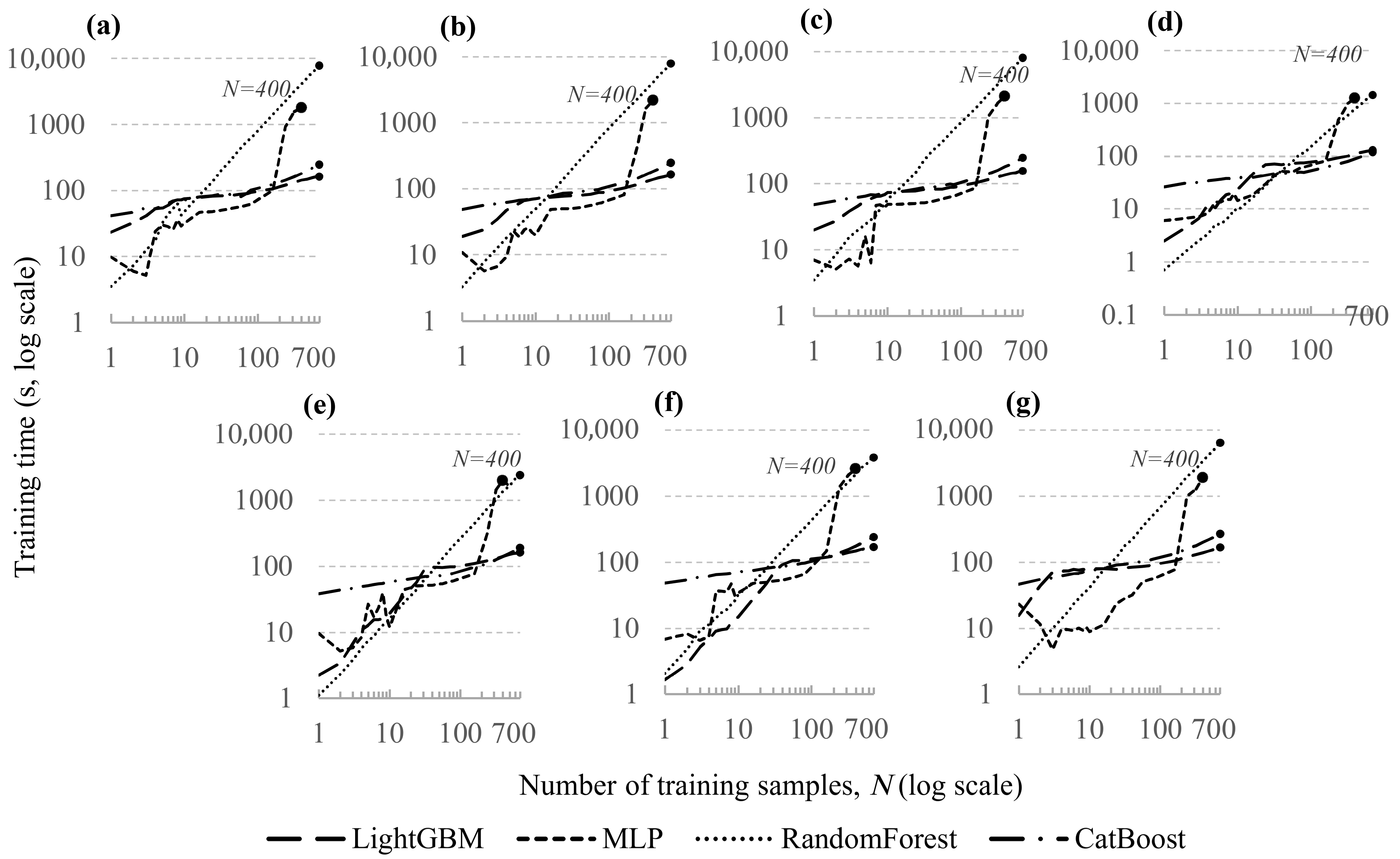 For the gradient-boosting models, the increase in computational cost is the most predictable and efficient. The training time of LightGBM on the full dataset is on the order of ≈130–170 s, while CatBoost requires ≈120–270 s depending on the target parameter. Here, training time is defined as the wall-clock time required to fit the model on training sets of different sizes.