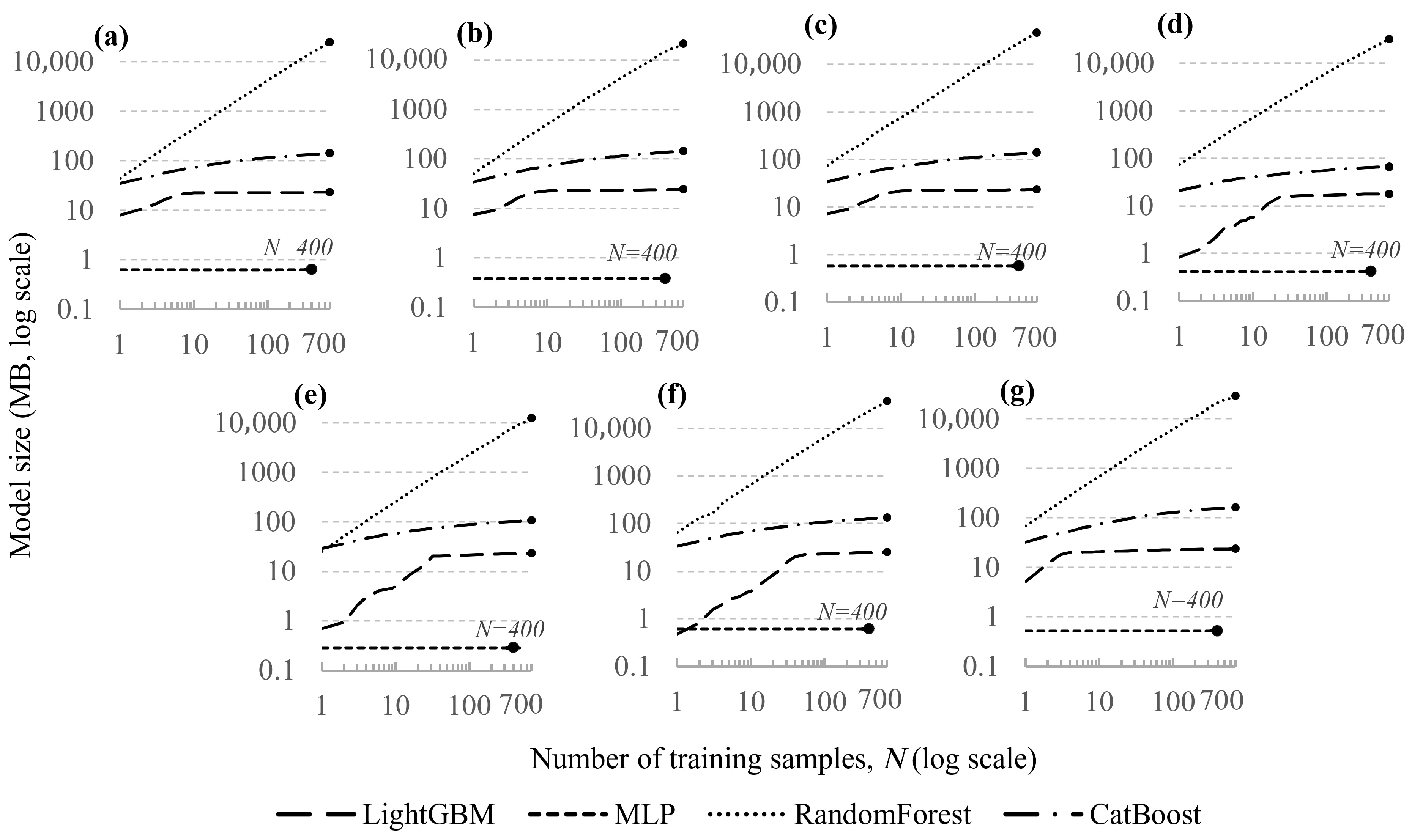 The MLP model is the most compact and is practically insensitive to the size of the training set: the file sizes remain in the range of ≈0.3–0.6 MB for all target parameters.