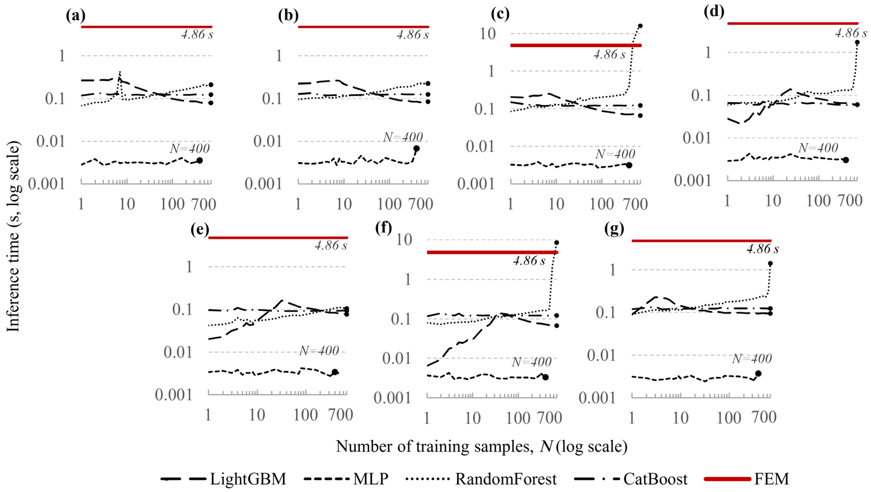 Figure 7 compares the prediction times of models trained on datasets of different sizes with the reference time of a single FEM simulation. The maximum inference times are summarized in