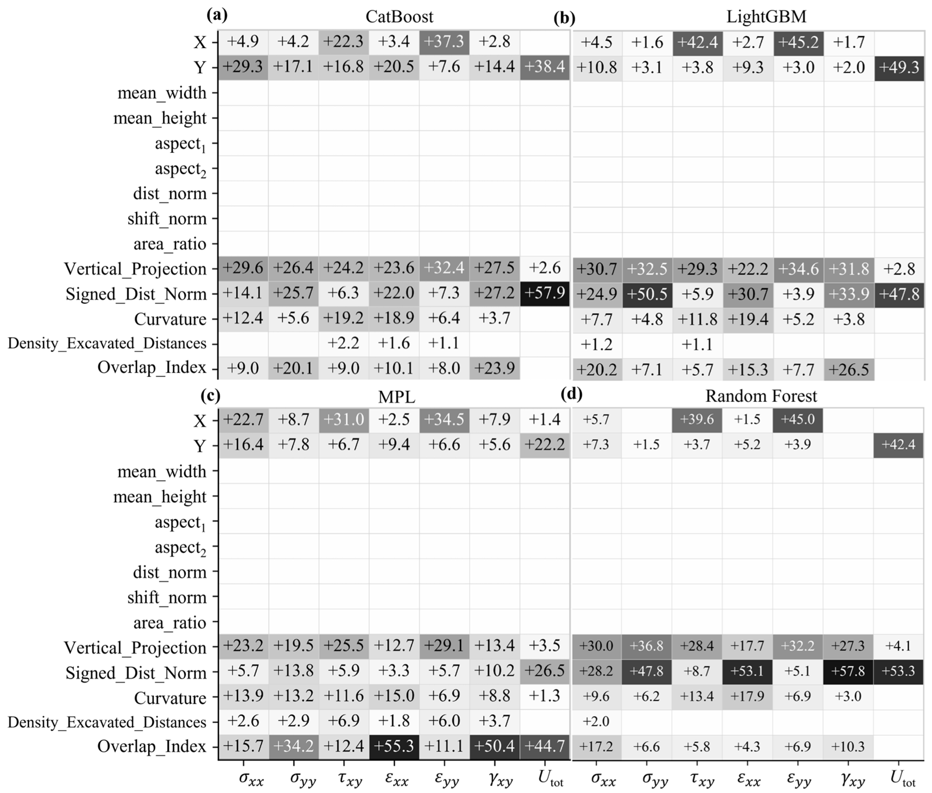 The heatmaps reveal a high degree of consistency among the tree-based models (RF, LightGBM, CatBoost). For these algorithms, the main share of importance (on average about 70–75%) is attributed to the engineered features (, , , , etc.), whereas the raw coordinates X and Y account for the remaining ≈25–30%. For the normal components , , , , the contribution of the engineered features reaches 80–90%, while for the shear components and total displacement (, , ) their share is about 55–60%. At the same time, global parameters such as , , , , and show zero importance for all models.
