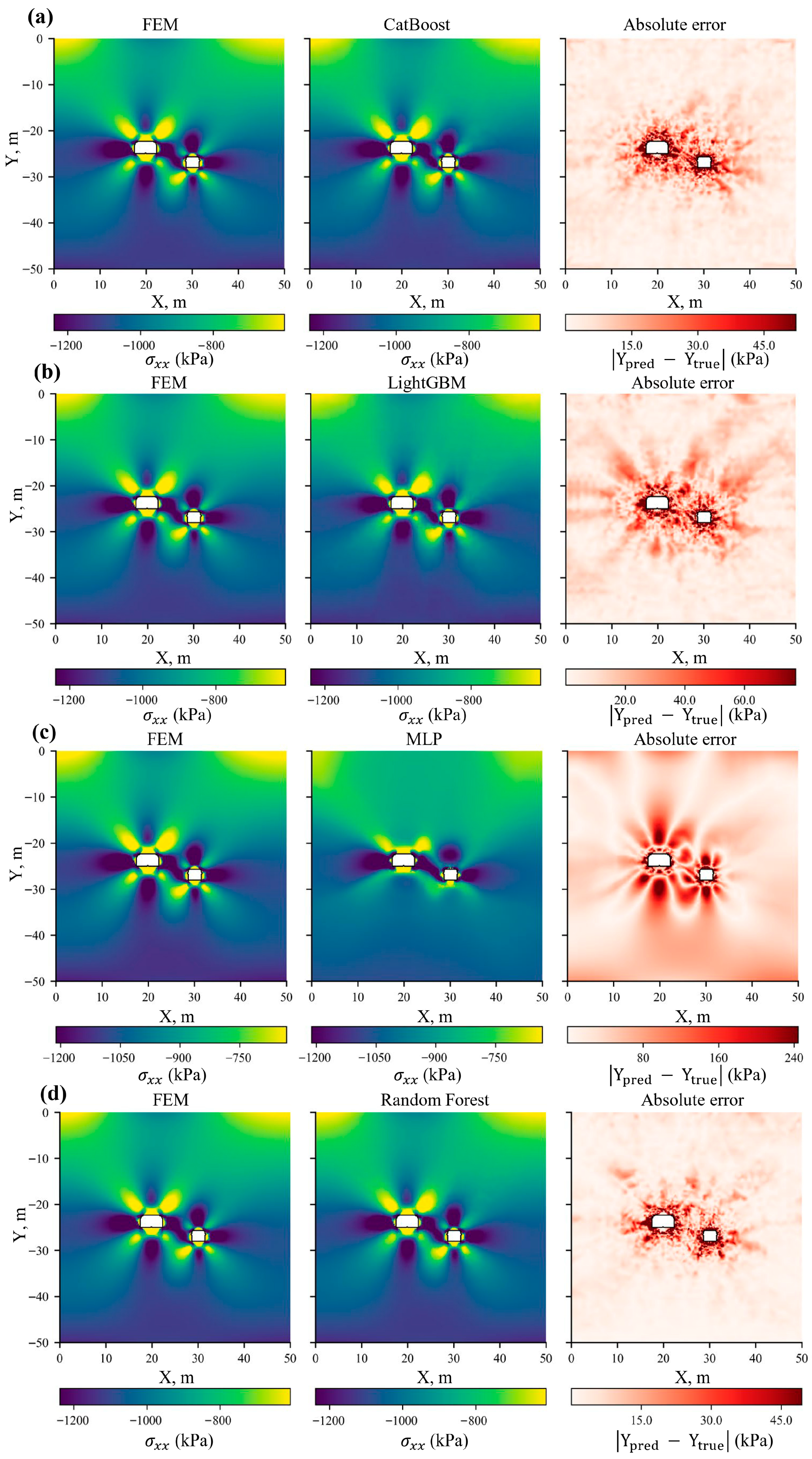 Table 4). The largest discrepancies for all models are localized in the immediate vicinity of the excavation boundaries, whereas in the bulk of the rock mass the errors remain relatively small. For LightGBM and Random Forest, the errors are mainly concentrated near the contours, with Random Forest providing a slightly more accurate reproduction of the fields; CatBoost is characterized by artifacts in the form of radially diverging “rays” emanating from the excavations. In the case of MLP, a fundamentally different pattern is observed: for
