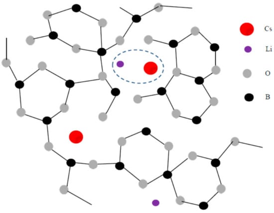 Schematic illustration of network structure of the mixed-cesium lithium borate glass. Near alkali ions, BØ4− and BØ2O− units are formed, where Ø and O are the bridging and non-bridging oxygens, respectively. The appearance of dissimilar pair (CsLi)2+ shown by dotted circle may cause the mixed alkali effect.