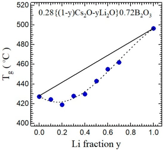 Li fraction y dependence of glass transition temperatures in the mixed-cesium lithium borate glasses, 0.28{(1−y)Cs2O-yLi2O}-0.72B2O3 [21].