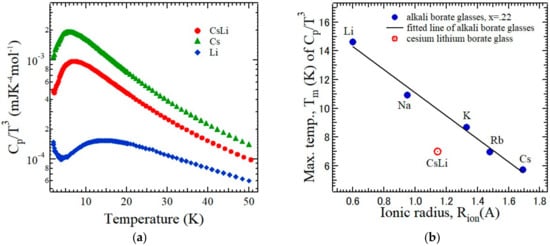 (a) Excess heat capacity of the single-alkali borate glasses, 0.22M2O-0.78B2O3 (M = Li, Cs), and mixed-alkali borate glasses, 0.11Cs2O-0.11Li2O-0.78B2O3 (CsLi); (b) mixed alkali effect on the maximum temperatures of Cp/T3 vs. ionic radius of alkali ion of the single-alkali borate glasses, 0.22M2O-0.78B2O3 (M = Li, Na, K, Rb, and Cs) and the mixed-alkali borate glasses, 0.11Cs2O-0.11Li2O-0.78B2O3 (CsLi) [27].