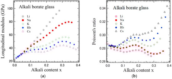 Poisson’s ratio, σ, is defined as the ratio between the transverse contraction strain and longitudinal extension strain in a stretched bar. Previous studies of the relation of the Poisson’s ratio with the glass structure showed that it was greater than 0.25 when the ions themselves are deformed under stress in addition to the network distortion [28,29]. The alkali content dependences of Poisson’s ratio, σ, of the single-alkali borate glasses are shown in Figure 6b. All the values of the Poisson’s ratio are greater than 0.25 in the single-alkali borate glasses, and alkali ions themselves are deformed under stress. In all the single-alkali borate glasses, two minima appear, except for the lithium borate glass, due to the lower maximum of the Li content of 0.27. Since the Poisson’s ratio is related to the glass network connectivity, it is governed by the middle range super-structural borate groups. The behavior of the Poisson’s ratio is complicated, while it may be caused by the following two factors for this behavior: