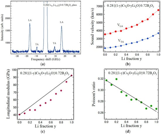 (a) Brillouin scattering spectrum of the mixed-cesium lithium borate glasses, 0.28{0.1Cs2O-0.9Li2O}-0.72B2O3. Li fraction y dependences of (b) LA and TA velocity; (c) longitudinal modulus L; (d) Poisson’s ratio σ of the mixed-cesium lithium borate glasses, 0.28{(1−y)Cs2O−yLi2O}−0.72B2O3. The solid lines show the linear relations in (c,d) [22].