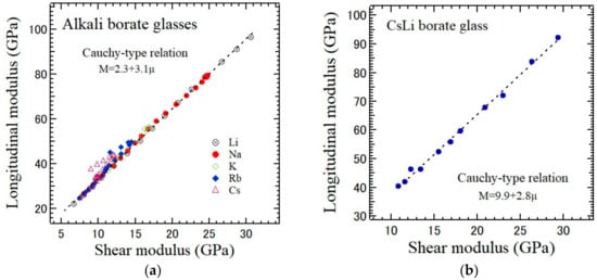 The Cauchy-type relation holds well for the single-alkali borate and mixed-cesium lithium borate glasses as shown in Figure 8a,b, respectively [4,22]. The fitted values of the single-alkali borate glasses are A = 2.3 GPa and B = 3.1; the two values do not show a difference between the alkali ions. However, the fitted values of the mixed-cesium lithium borate glasses are A = 9.9 GPa and B = 2.8. For both glasses, the value of B is about 3, while the value of the mixed-cesium lithium borate glasses is slightly lower. The large value of A of the mixed-cesium lithium borate glasses may suggest that the MAE may induce a local anisotropy and enhance the deviation.