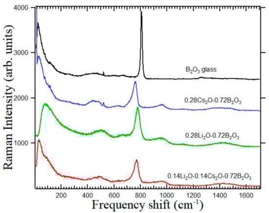 Broadband Raman scattering spectra of the B2O3, 0.28Li2O-0.72B2O3, 0.28Cs2O-0.72B2O3, and 0.14Cs2O-0.14Li 2O-0.72B2O3 glasses [22,34,35].