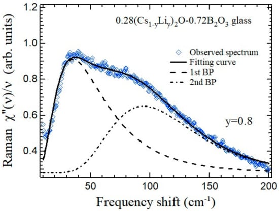 The boson peak spectra of the mixed-cesium lithium 0.28{(1−y)Cs2O-yLi2O}-0.72B2O3 glasses were studied by Raman scattering and splitting of the boson peak was observed [21]. The results of fitting of the boson peak spectrum of the 0.28{0.2Cs2O-0.8Li2O}-0.72B2O3 glass (y = 0.8) between 10 and 200 cm−1 are shown in Figure 12 [21]. The boson peak of the single-alkali borate glasses is well fitted by a log-normal function. However, the boson peak of the mixed-alkali borate glasses has a distorted broad peak and such a single mode fitting is impossible. Therefore, the broad peak is fitted by two log-normal functions.