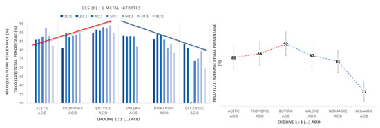(Left) Summary of the maximum percentage of the metal oxide YBa2Cu3O7-x (YBCO or 123) obtained, via different deep eutectic solvents (DESs) formed by choline hydroxide and acetic/propionic/butyric/pentanoic/nonanoic/decanoic acid. The red arrow indicates a positive trend towards higher total phase percentage obtained, whereas the blue arrow indicates an opposite trend. (Right) Graphic indicating the average total phase percentage obtained per segment of DES.