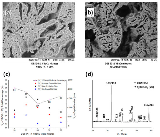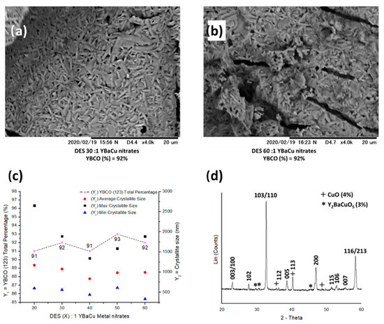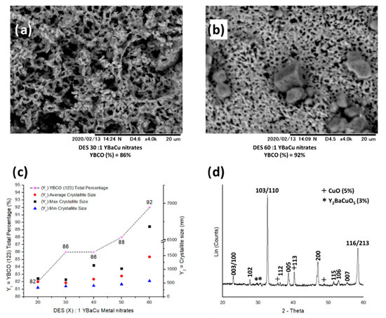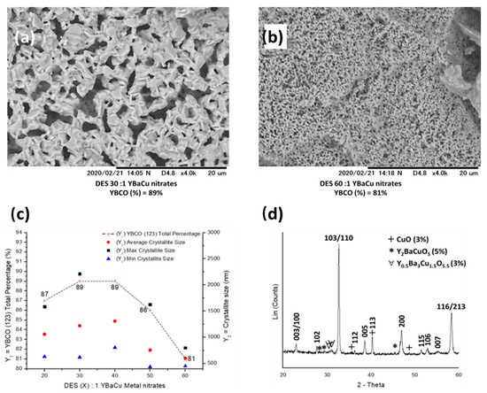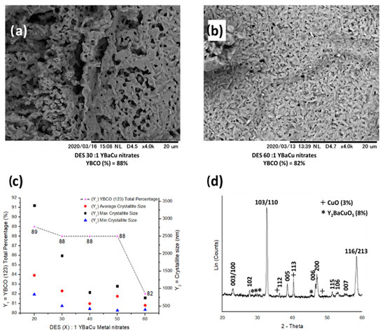 (a,b) SEM micrographs showing the morphology exhibited by the crystallites, synthesised using choline hydroxide 1:1 nonanoic acid and molar ratios of (a) DES 30:1 YBaCu metal nitrates, and (b) DES 60:1 YBaCu metal nitrates. (c) graphical representation of the total phase percentage of YBCO (123), and crystallite sizes per DES (X):1 YBaCu metal nitrates molar ratios use in the reaction, with x values of 20 ≤ x ≤ 60. (d) indexed power diffraction pattern of the synthesis of YBCO (123) via DES 30:1 YBaCu metal nitrates.