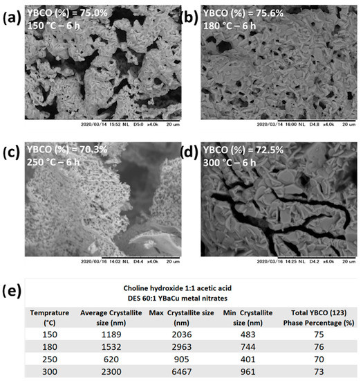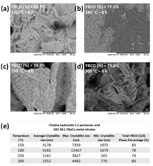 Choline hydroxide 1:1 pentanoic acid, DES 30:1 YBaCu metal nitrates being held at different dehydration temperatures, provided the most contrasting and exciting results. Micromorphologically speaking, the reaction being dehydrated at 80 °C showed plate-like particles with an average crystallite size of 1151 nm. In contrast, despite the micromorphology likewise being plate-like particles (Figure 8a–d), the sizes of the crystallites analysed were significantly bigger, with average size values of 3178 nm at 150 °C, 4182 nm at 180 °C, and 2352 nm at 300 °C (Figure 8e). Additionally, maximum crystallite sizes can exemplify even further those differences, with values being 1576 nm at 80 °C, 7359 nm at 150 °C, 15, 467 nm at 180 °C, and 4482 nm at 300 °C (Figure 8e). Similarly to what was observed with the DES made with acetic acid and being held at different dehydration temperatures, the synthetic performance presented by choline hydroxide 1:1 pentanoic acid, DES 30:1 YBaCu metal nitrates, also decreases compared to the obtained at 80 °C with 90% of the total phase percentage belonging to the metal oxide, with corresponding values of total phase percentage of 83% at 150 °C, 78% at 180 °C, 74% at 250 °C, and 80% at 300 °C (Figure 8e). Finally, analogue to the results previously described by the DES formed with acetic acid and dehydration temperature of 250 °C, the micromorphology exhibited by choline hydroxide 1:1 pentanoic acid, DES 30:1 YBaCu metal nitrates, also displayed lower dimensions crystallites, around 101 nm in size (Figure 8e), and much bigger flat plate-like particles (Figure 8b), with sizes around 3827 nm (Figure 8e).