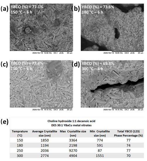 Morphological behaviour exhibited by the use of choline hydroxide 1:1 nonanoic acid, DES 20:1 YBaCu metal nitrates, can be easily described by an almost constant crystal growth with an increase of the dehydration temperature, going from 1059 nm at 80 °C, to 1850, 1194, 2036, and 2774 nm obtained at 150, 180, 250, and 300 °C, respectively (Figure 9e). For temperatures ranging from 150 to 250 °C, the morphology of the crystallites can be described as plate-like particles, added to much smaller shapeless crystals (Figure 9a–c). The plate-like particles became heavily predominant at 300 °C (Figure 9d). In terms of the synthetic performance, unfortunately and similarly to results previously described by dehydration processes being carried out at different temperatures than 80 °C, is also hampered, providing values of 77%, 74%, 77%, and 70% of the total phase percentage belonging to the desired metal oxide, for dehydration temperatures of 150, 180, 250, and 300 °C, correspondingly (Figure 9e).