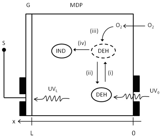Experimental configuration used to perform UV absorption measurements on MDP films of thickness L. UV0 and UVL are, respectively, the incident UV intensity at the film surface and transmitted through the film thickness. The internal photo-cyclic oxidation processes for DEH are indicated according to processes (i)–(iv) described in the discussion section. G = glass substrate, S = spectrometer.