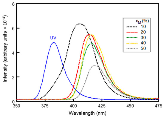 The results obtained by performing spectral scans on a series of unexposed PE MDP films are shown in Figure 2. Data are included for DEH doping concentrations that range from cM = 10% to cM = 50%. The spectral output from the UV LED is also included for reference. Relative to the UV reference the spectral responses recorded for the MDP films are observed to be red shifted to longer wavelengths. Similar spectral red shifting was detected in the recorded spectra for unexposed PC and PS MDP films.