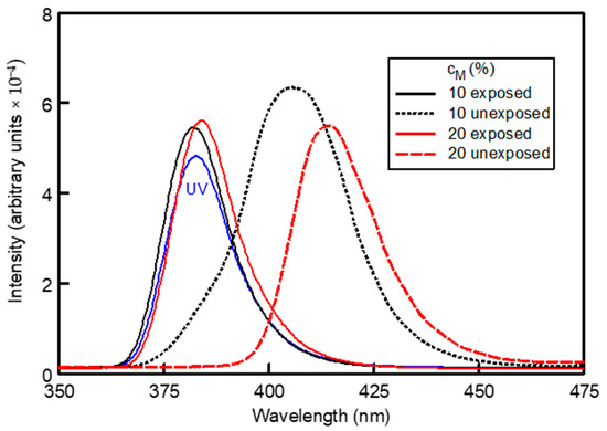 Spectral scans were repeated on the MDPs following a full exposure period (4 × 105 s) to the UV LED. The scans obtained for the PE MDPs are given in Figure 3 for the cM = 10% and cM = 20% films. In this plot the UV reference has again been included together with the original unexposed scans from Figure 2 at these doping concentrations. Compared to the unexposed scans, the scans obtained from the fully exposed films no longer exhibit the original red shift but are now observed to be in the same range of the UV reference.