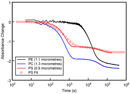 Absorbance kinetics recorded for the 2.5 μm thick PE sample in Table 1 at different regions across the film surface. The open circles show the optimum fit to the composite data using Equation (3) and the parameters for the P(t) function in Equation (2) as described in the main text.