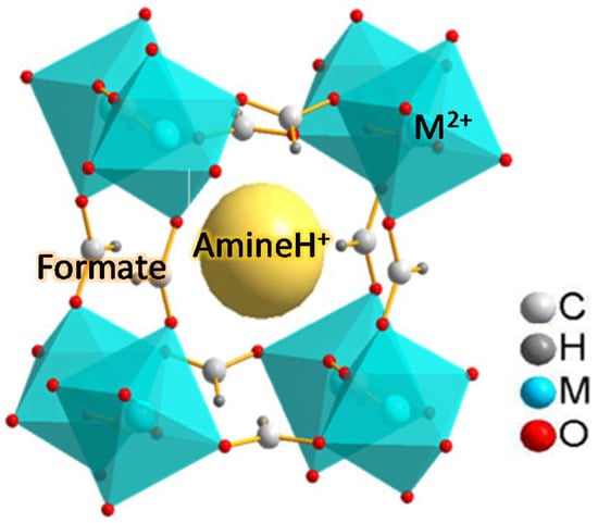In this context, the study of the thermal decomposition of coordination polymers with perovskite-type structures as potential self-template precursors of metal or metal oxide materials is of interest. Hybrid perovskites are some of the most studied covalent frameworks due to their interesting functional properties reported along the last two decades. Among them, compounds of the formula [AH][M(HCOO)3] (Figure 1) have attracted great interest due to their dielectric [18,19,20], magnetic [21,22], and multiferroic [23,24,25,26] properties.
