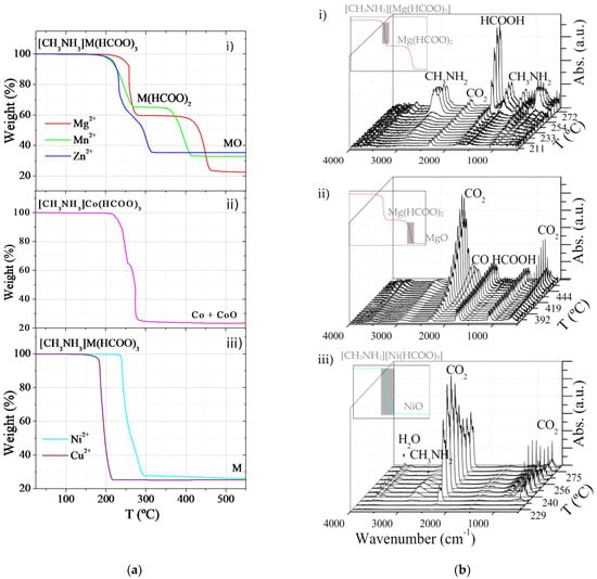 (a) Thermogravimetric analysis (TGA) curves of [CH3NH3][M(HCOO)3] where: (i) M2+= Mg2+, Mn2+, and Zn2+; (ii) M2+= Co2+ and (iii) M2+= Ni2+ and Cu2+. (b) Infrared (IR) spectra of released gases from [CH3NH3][M(HCOO)3] compounds at different temperatures: (i) [CH3NH3][Mg(HCOO)3] between 200 and 280 °C, (ii) [CH3NH3][Mg(HCOO)3] between 370 and 470 °C, and (iii) [CH3NH3][Ni(HCOO)3] between 208 and 280 °C. Insets: the temperature range (in gray) of the IR experiments in the thermogravimetric (TG) curves.