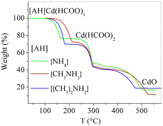 TGA curves of [AH][Cd(HCOO)3] where AH+= NH4+, CH3NH3+, and (CH3)2NH3+.