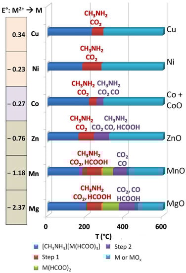 In addition, it has been observed that lower reduction potentials sequentially stabilize the intermediate M(HCOO)2, so that Cu2+- and Ni2+-compounds show only one degradation step, Co2+- and Zn2+-compounds show two degradation steps and finally the M(HCOO)2 species can be isolated for Mg2+- and Mn2+-materials (Figure 4).