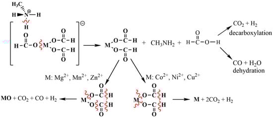 Thermal degradation of the [CH3NH3][M(HCOO)3] compounds, where M2+= Mg2+, Mn2+, Co2+, Ni2+, Cu2+, and Zn2+. Solid species, characterized by XRPD, are represented in bold.