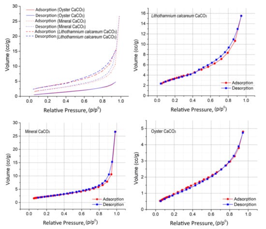 L. calcareum CaCO3 had the largest surface area compared with other samples and, consequently, a smaller pore volume, in addition to nitrogen adsorption and desorption isotherms similar to those observed by Xia et al. [44]. Inorganic mineral CaCO3 had surface area, pore volume and adsorption and desorption isotherm values similar to those of L. calcareum CaCO3, while the values of oyster shell CaCO3 were lower than those of L. calcareum CaCO3.