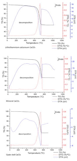 The thermogravimetric profile of L. calcareum CaCO3 indicated decomposition by CO release at 670.9 °C (Table 3 and Figure 2), a temperature consistent with data from the literature [45]. This decomposition event corresponds to the endothermic peak identified from differential thermal analysis (DTA) at the same temperature. The mass loss of L. calcareum CaCO3 was similar to that reported by Li et al. [46].