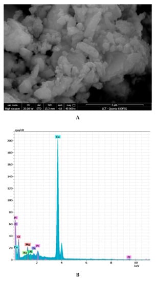 Inorganic mineral CaCO3 (Figure 4A) presented well-defined scalenohedral crystals, which are defined by crystallographic planes [47,48]. The crystal size range was below 1 μm, which was smaller than that of L. calcareum CaCO3. The EDS plot (Figure 4B) revealed the presence of calcium, carbon and oxygen as the major components. Oyster shell CaCO3 (Figure 5A) had a plate-like morphology, formed by fibrous particles on a 1 nm scale. EDS analysis (Figure 5B) indicates the presence of calcium.