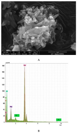 (A) Scanning electron microscopy (SEM) images with a magnification of 100,000× that demonstrated scalenohedral crystals for the inorganic mineral CaCO3. (B) Energy-dispersive spectroscopy (EDS) analysis: from the information contained in the EDS spectrum it is possible to obtain quantitative information on the sample composition on a microscopic scale. In the spectrum, Platinum (Pt), Carbon (C), Oxygen (O) and Magnesium (Mg) were identified, in addition to Calcium (Ca).