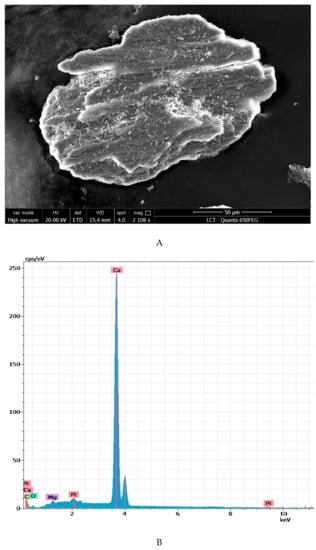 (A) Scanning electron microscopy (SEM) images with 2108× magnification that exhibited a plaque-like morphology with a fibrous appearance for the oyster shell CaCO3. (B) Energy-dispersive spectroscopy (EDS) analysis: from the information contained in the EDS spectrum it is possible to obtain quantitative information on the sample composition on a microscopic scale. In the spectrum, Platinum (Pt), Carbon (C), Oxygen (O) and Magnesium (Mg) were identified, in addition to Calcium (Ca).