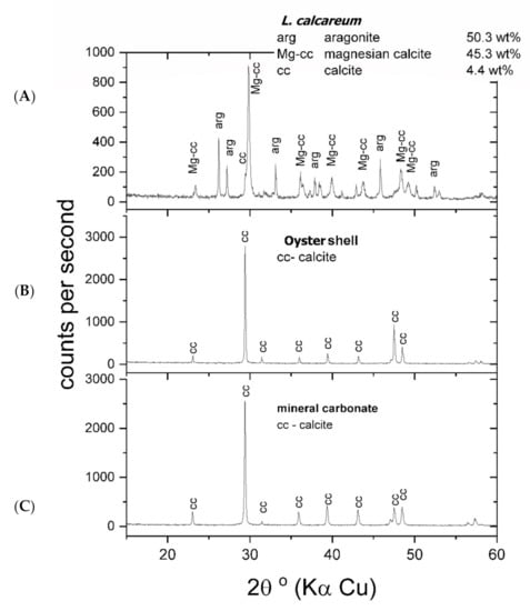X-ray diffractograms (Figure 6) of the three samples show that L. calcareum CaCO3 contains aragonite (50.3 wt%), magnesian calcite (45.3 wt%) and calcite (4.4 wt%), as determined by the XRD–Rietveld method. Inorganic mineral and oyster shell CaCO3 samples were composed solely of calcite.