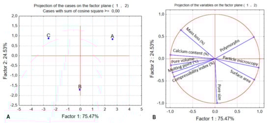 From the results obtained above, we constructed two-dimensional graphs of the main components (Figure 7). The two new variables created in the same dimension—principal component analysis (PCA1 and PCA2)—retained 100% of the information contained in the original variables. We also verified that PCA1 explained more than 70%, while PCA2 explained 24.53% of the data variability, which was better defined only by pore size. For L. calcareum CaCO3 (A), factor 1 interpreted the polymorphism, particle size and provided a well-represented surface area. In contrast, for inorganic CaCO3 (B), the pore size stood out and, for oyster shell CaCO3 (C), factor 1 mainly interpreted calcium content and mass loss. The oyster shell CaCO3 sample was the most different from the other components, while the inorganic mineral CaCO3 sample (B) registered a larger group of variables. Thus, we compared the three groups, found that the samples differed in all variables, while those that stood out the most were calcium content and pore size, with values above 0.999.
