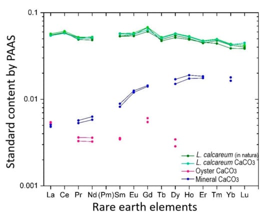 Chemical differences between the three samples were related to the mineralogical composition, since L. calcareum CaCO3 was composed of magnesian calcite, calcite and aragonite, while the other two samples of calcium carbonate were composed exclusively of calcite. There are differences in the partition of trace elements between aragonite, low-Mg calcite and high-Mg calcite due to differences between their crystal structures [55]. Figure 8 and Figure 9 show the content of trace elements (ppm) divided by the average composition of the upper terrestrial crust [56], a commonly used form of data representation in geochemistry. Regarding the REE (Figure 8), the L. calcareum CaCO3 sample showed a practically horizontal pattern, indicating that there is no preferential selective incorporation of individual REE. The rare earth patterns of L. calcareum CaCO3, with stable, differ from the composition of seawater, which has depleted cerium levels (negative Ce anomaly) and a trend of increasing amounts of heavy REE [57]. Inorganic elements in seaweeds have two likely sources: elements dissolved in seawater or solid particles in suspension [58]. The similarity of L. calcareum CaCO3 to the average of the upper continental crust, in terms of the REE distribution, may suggest that the uptake of suspended solid particles played an important role in the mineralisation of this seaweed.