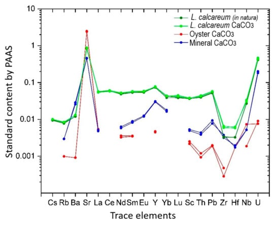 Trace elements help us to distinguish between carbonates from different sources, as analysed in this study. L. calcareum CaCO3 showed levels of trace elements around one order of magnitude higher than those of oyster shell and inorganic mineral CaCO3. Among the trace elements analysed, several were below the detection limits for inorganic mineral and oyster shell CaCO3 (Table 4).