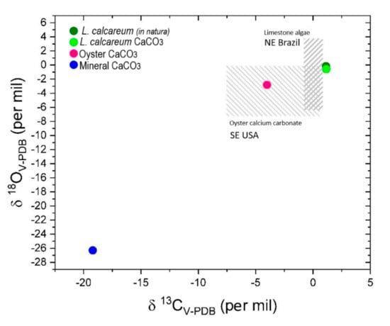 The data on the stable carbon and oxygen isotopes (Figure 10) of L. calcareum and oyster shell CaCO3 fall within the category of shallow-water biogenic marine carbonates, with a small fraction in relation to the V-PDB standard (Vienna Pee Dee Belemnite international standard) [59]. Published data on stable isotopes of L. calcareum CaCO3 are rare. Data on carbonate algae (Lithothamnion sp. and Halimeda sp., both composed of calcite and aragonite) were obtained by Rocha [60] in samples collected from the northeast Brazilian coast. The L. calcareum CaCO3 sample analysed in this study is within the compositional group of 66 samples analysed by Rocha [60], who described variations in isotopic ratios in samples of the same species collected at different depths as a consequence of water temperature. Our data on the stable isotopic composition of the oyster shell of Crassostrea virginica is within the isotopic range of oysters found in the James River estuary, Virginia (USA), as published by Grimm et al. [61].