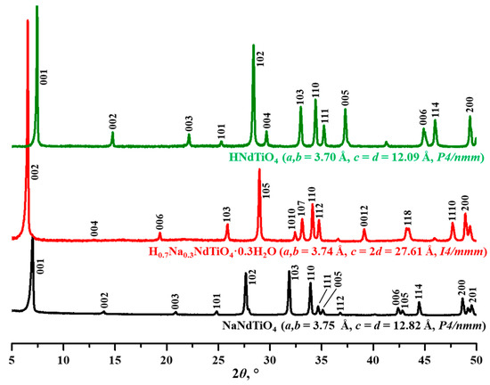Initial alkaline titanate NaNdTiO4 and its protonated forms were identified using XRD analysis (Figure 1). Tetragonal lattice parameters of NaNdTiO4 (a = b = 3.75 Å c = 12.82 Å) and HNdTiO4 (a = b = 3.70 Å c = 12.09 Å) were found to be consistent with the literature values [46]. In the course of the partial protonation, the interlayer distance d is seen to increase (this is reflected in the shift of low-angle 00l reflections on the diffractogram to the region of lower values), which indicates probable water intercalation accompanying the ion exchange. Otherwise, the d value should have reduced since protons are much smaller than sodium cations. Moreover, the partially protonated form is amenable to indexing in another space group (I4/mmm instead of P4/nmm) and is characterized by doubled c parameter, which is not observed in the case of NaNdTiO4 and HNdTiO4. The space group change and the c parameter doubling appear to be caused by a probable transformation of the adjacent perovskite slabs conformation from staggered to eclipsed. The completely protonated titanate HNdTiO4, apparently, possesses the slabs arrangement similar to that of NaNdTiO4 and does not contain a noticeable amount of interlayer water.