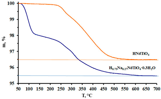 TG curves of the protonated samples are presented in Figure 2. In both cases, two main sections on the curves can be distinguished. The first of them corresponding to the temperatures up to 200 °C refers to deintercalation of the interlayer water molecules resulting in the formation of an anhydrous partially or fully protonated titanate. At the second section (250–650 °C), the latter experiences topochemical dehydration consisting in the binding of the interlayer oxygen atoms and protons into water molecules, their liberation and closing vertices of titanium-oxygen octahedra of adjacent perovskite slabs. In this way, final thermolysis products follow a gross formula Na1−xNdTiO4−x/2, where x is the amount of protons in the initial compound. Processing of the curves allowed us to establish quantitative compositions signed in Figure 2. The partially protonated titanate contains a perceptible amount of intercalated water released during heating at low temperatures. It corresponds to the formula H0.7Na0.3NdTiO4·0.3H2O (specified H0.73Na0.27NdTiO4·0.3H2O). The completely protonated HNdTiO4 was found to exist in a practically anhydrous state.