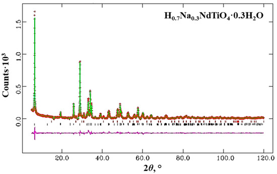 The structural model of the partially protonated titanate H0.7Na0.3NdTiO4·0.3H2O was refined by the Rietveld method based on the XRD data (Figure 3) [62]. The XRD patterns collected made it possible to determine with high accuracy the positions of all the atoms constituting the compound, besides hydrogen (Table 1). All the parameters calculated fall in a physically reasonable range (although the Na occupancy factor and position are hardly reliable) and are consistent with the calculation data for the related La-containing titanate. Thus, the refinement of the H0.7Na0.3NdTiO4·0.3H2O structure can be considered successful.