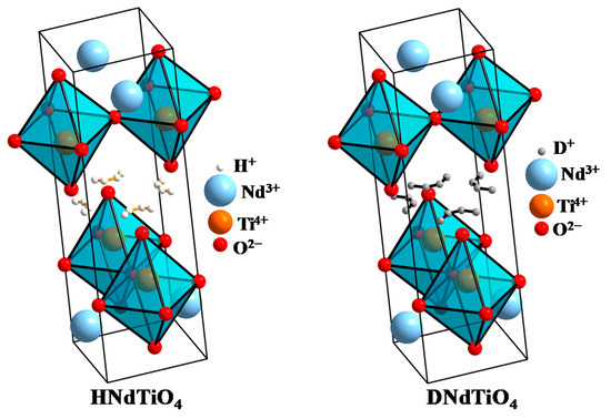 Data on the comparison of HNdTiO4, the structure of which was refined here, and its deuterated counterpart DNdTiO4, the structure of which was refined in one of the earlier reports [64], are shown in Table 3 and Figure 5. Generally, the structural models of both compounds can be considered practically identical. The deuterated sample demonstrates a slightly greater lattice parameter in comparison with those of the non-deuterated one. In the latter protons are located closer to the axial oxygen that binds them than deuterium cations (0.919 Å vs. 0.932 Å). At the same time, the titanium-oxygen octahedron distortion is not proportional to the lattice parameter increasing. In particular, the bond Ti–O3 proves to be 0.01 Å longer in the deuterated titanate.