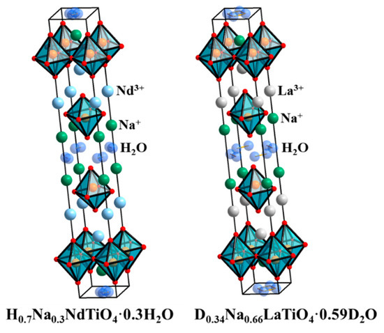 The graphical comparison of the partially protonated hydrated titanate H0.7Na0.3NdTiO4·0.3H2O investigated here and La-containing deuterated compound D0.34Na0.66LaTiO4*0.59D2O reported in [63] is presented in Figure 6. Both structures are practically identical. The distortion of titanium-oxygen octahedra in the form of elongation towards the ion-exchangeable interlayer space direction is hardly noticeable in the La-containing titanate. Equivalent positions of water molecules are significantly distant from each other. In the case of the Nd-containing compound, they are located almost at the same point directly between two sodium cations. In addition, the sodium cation is shifted towards the interlayer space, which is apparently due to the lower occupancy of equivalent water positions in the crystal.