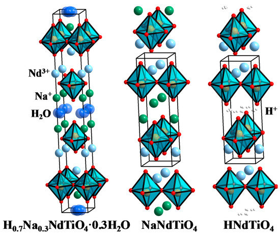 Comparison of the H0.7Na0.3NdTiO4·0.3H2O (this work), NaNdTiO4 (data from [42]) and HNdTiO4 (this work) structures.